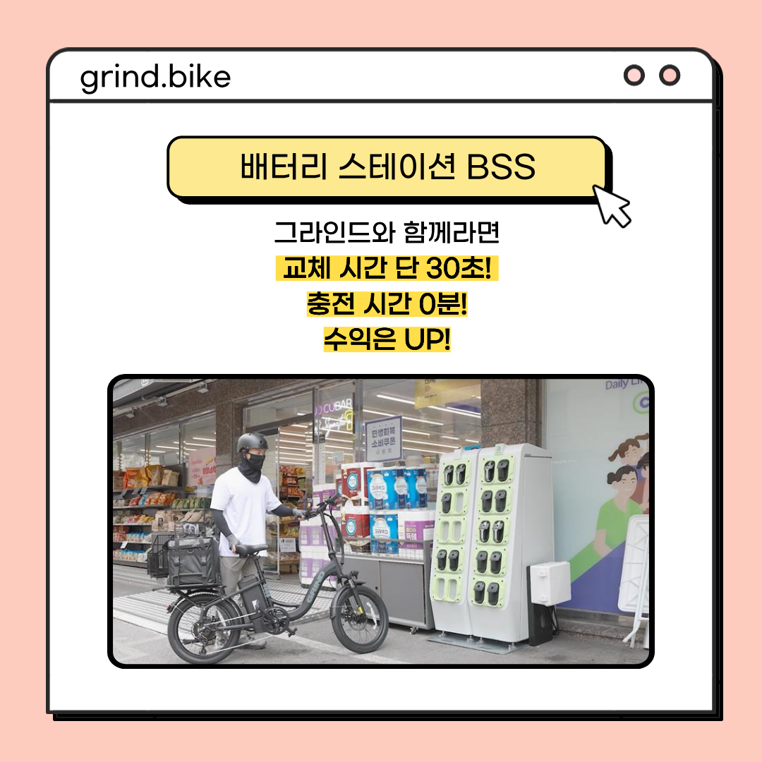 그라인드 전기자전거는 근처 편의점 등 배터리 스테이션에서 방전된 배터리를 완충된 배터리로 30초 만에 교체하는 구조예요.