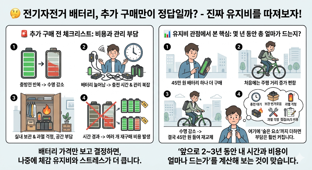단기적으로는 추가 구매가 단순해 보일 수 있지만, 장기적으로는 반복 교체 비용과 충전 관리 부담까지 함께 따져봐야 합니다.