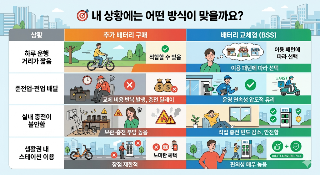 | 준전업·전업 배달 | 반복 교체 부담 가능성 큼 | 운영 연속성 측면에서 유리할 수 있음 |