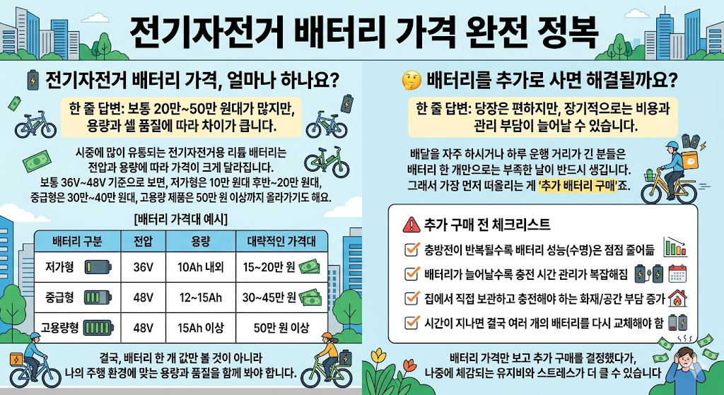 전기자전거 배터리 가격은 용량과 셀 구성에 따라 20만 원대부터 50만 원 이상까지 차이가 납니다. 하지만 실제로 더 중요한 것은 배터리 한 개의 구매 비용보다 앞으로 몇 번 교체하게 될지, 그리고 그 사이에 들어가는 충전 시간, 보관 부담, 관리 비용입니다. 따라서 전기자전거 배터리 가격은 단순 구매가가 아니라 유지비 관점에서 함께 비교하는 것이 더 현실적입니다.