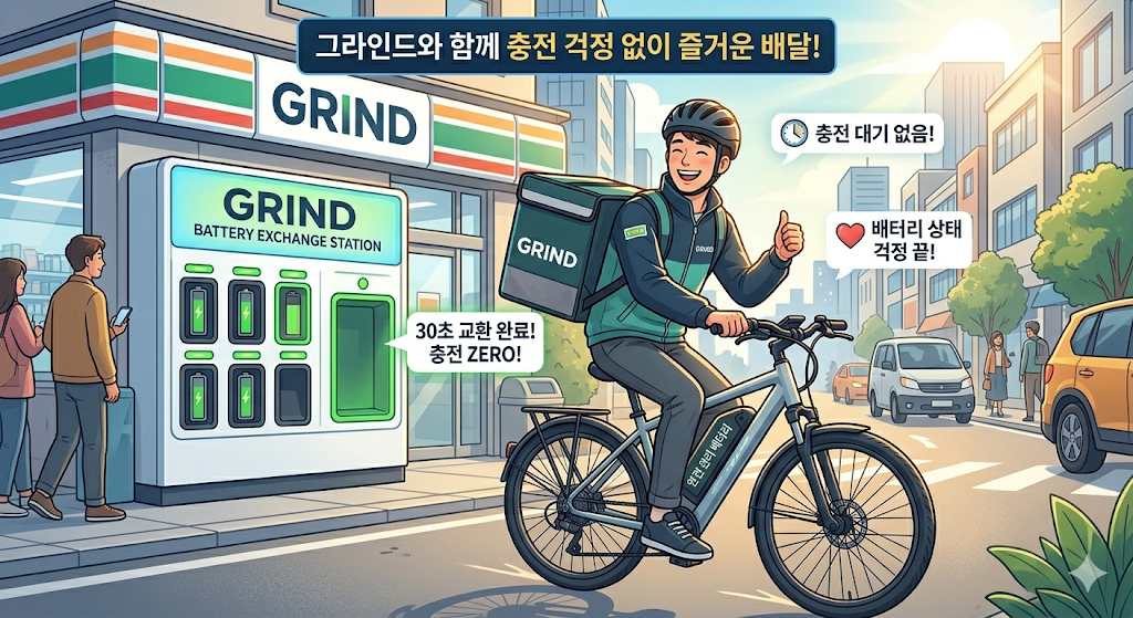 그라인드 전기자전거는 근처 편의점 등 배터리 스테이션에서 방전된 배터리를 완충된 배터리로 30초 만에 교환하는 구조예요.