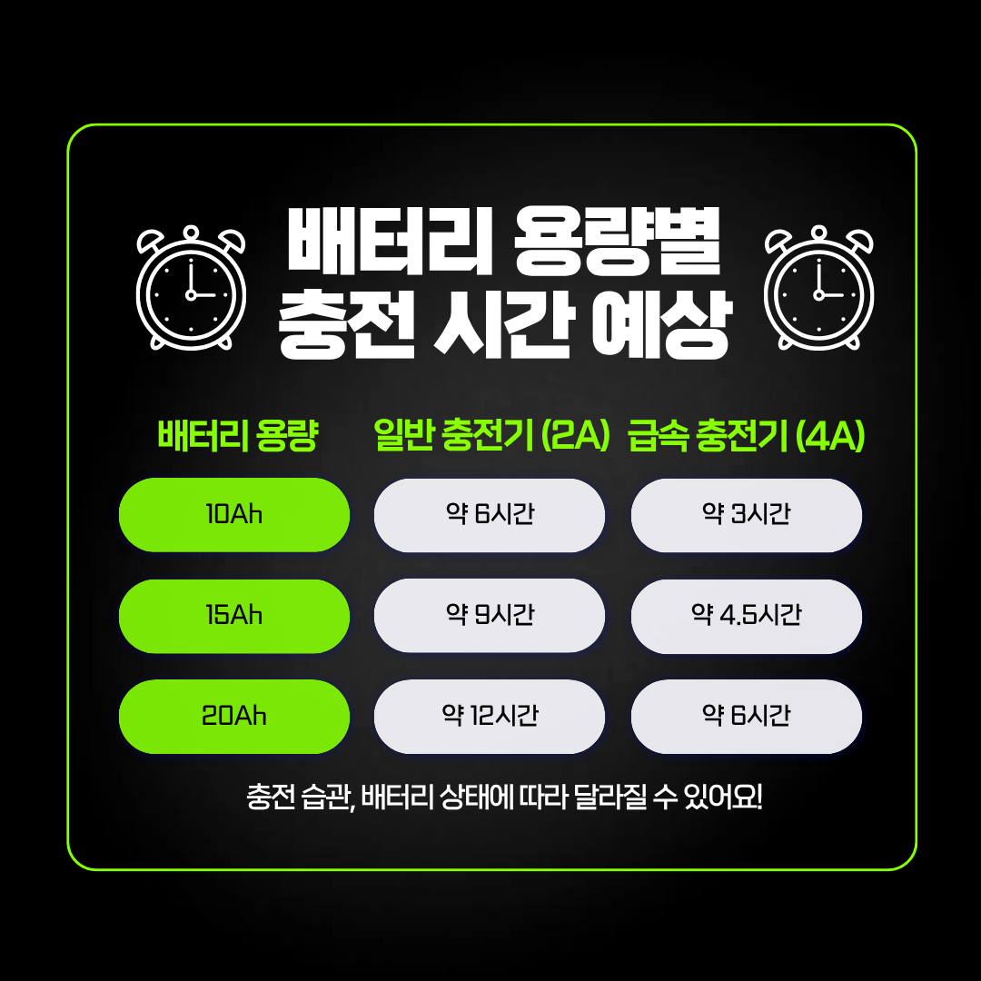 | 15Ah | 약 9시간 | 약 4.5시간 | 중거리 배달 및 레저용 |