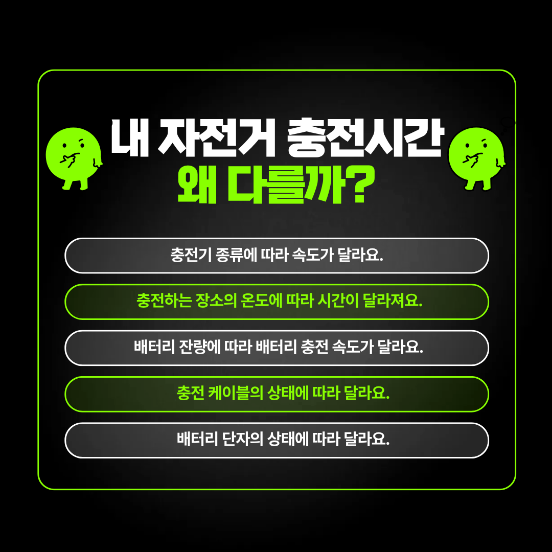 공식대로 계산하더라도 실제 상황에서는 아래 3가지 요인들에 따라서 전기자전거 충전 시간이 달라지기도 합니다.