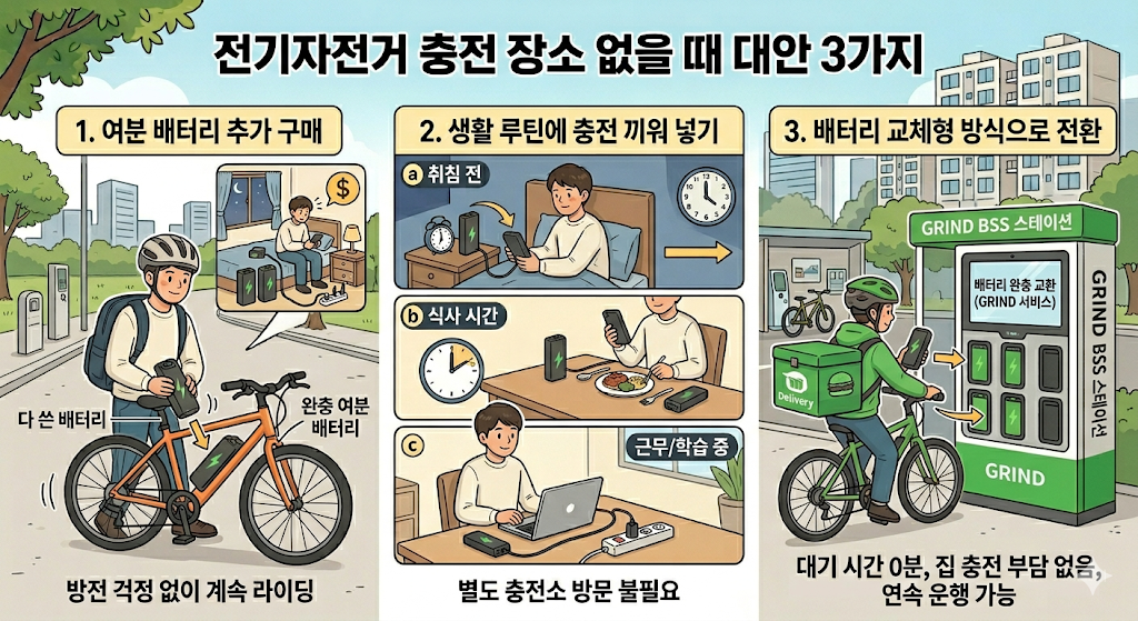 현재 국내 환경에서는 전기자전거 충전 장소를 안정적으로 확보하는 것 자체가 쉽지 않습니다. 여분 배터리 구매가 부담스럽고 집 충전도 불안하다면, 장소를 찾는 방식보다 배터리 운영 방식 자체를 바꾸는 접근이 더 현실적일 수 있습니다.